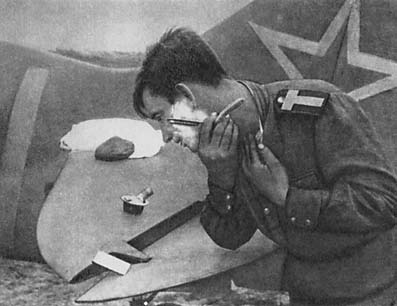 Ю. Т. Еременко вручает партбилет перед вылетом на боевое задание стрелку-радисту В. К. Судакову