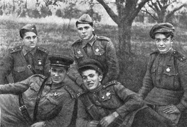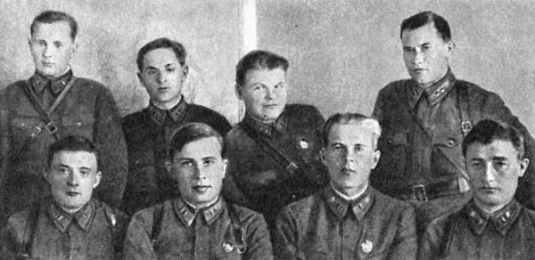 Комсомольские работники дивизии. В первом ряду (слева направо): Н. М. Гладкий, В. И. Степанов. Во втором ряду: М. А. Софиенко, Е. Н. Третьяков, Н. В. Бобровский