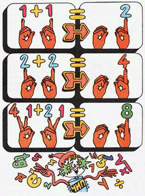 — Это по-вашему один, а я не пальцы считаю, а числа. Есть же разница между мизинцем и безымянным пальцем? Значит, можно мизинцем обозначать 1, а безымянным 2. А вот теперь мы снова мизинец поднимаем. Получается два пальца — безымянный и мизинец. По-вашему это 2, а по-моему — 3. Почему 3? Очень просто. Мизинец — 1, безымянный — 2, вместе — 3. Теперь эти два опускаем, средний палец поднимаем. Получается — 4.