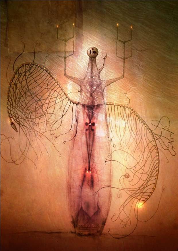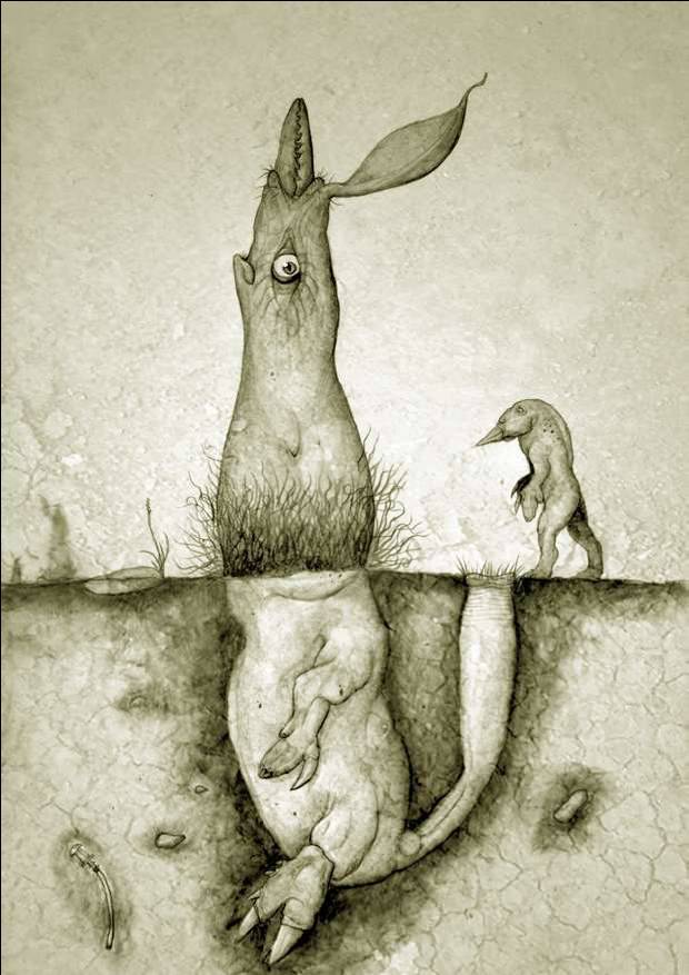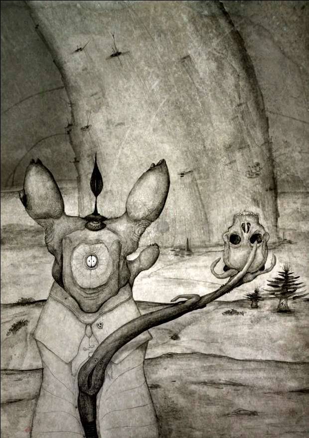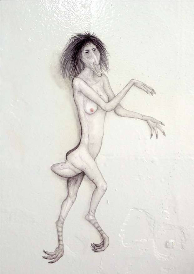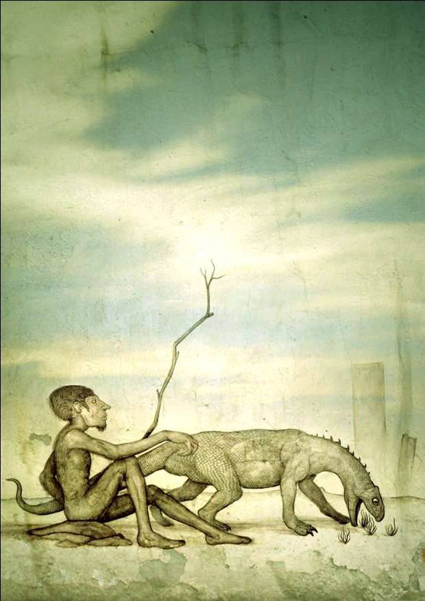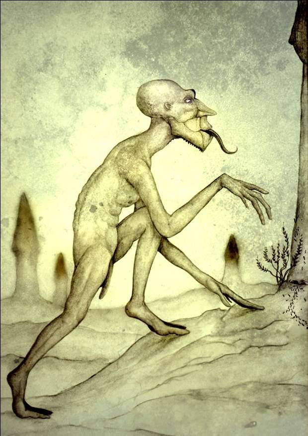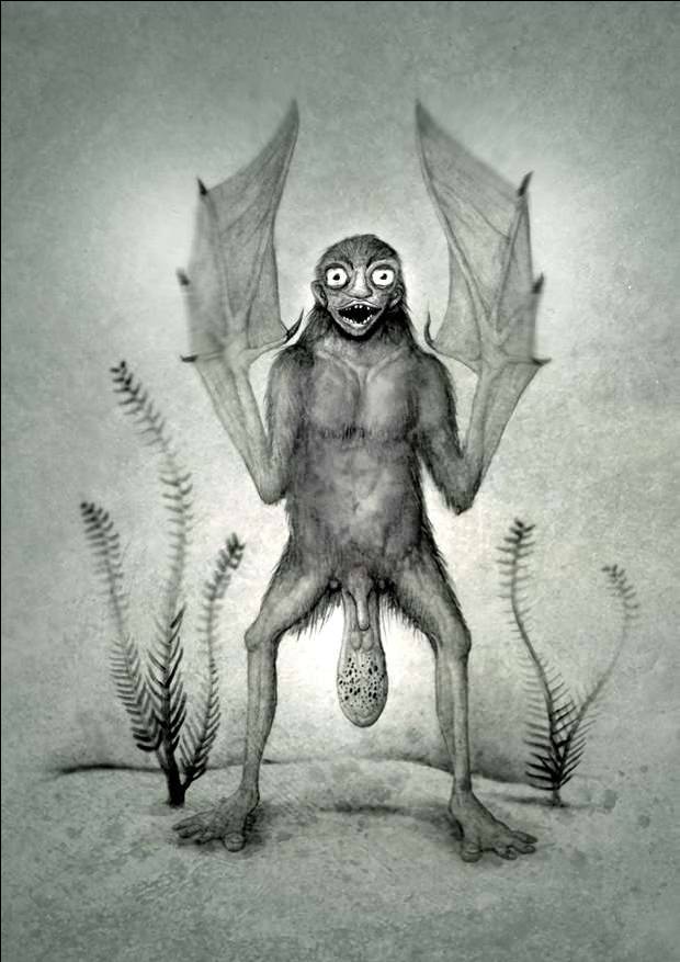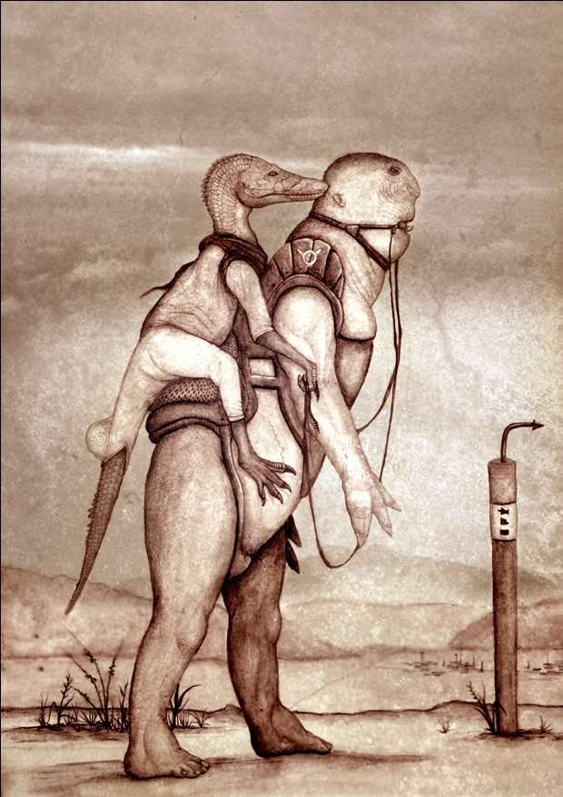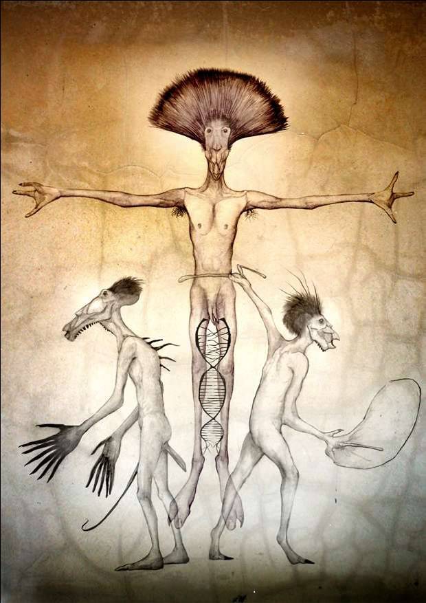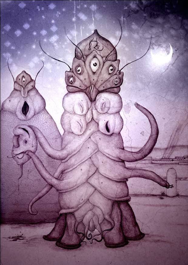 Архетип Жуколицего между двумя его искажёнными потомками. Слева от него: полидактил с увеличенным фаллосом, разводимый как жертвенное существо в одной из множества различных религий Машин. Справа: одноразовое произведение искусства — существо, созданное, чтобы играть своими изменёнными пальцами, как набором барабанов, завывая мелодию какой-либо популярной песни.