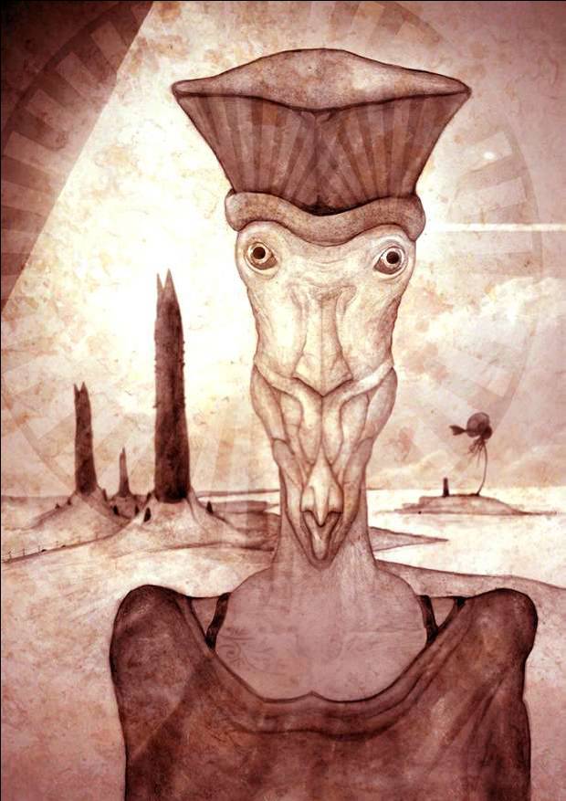 Обнажённый Терраморф демонстрирует сильно отклонившуюся, но всё же ещё причудливо человеческую анатомию, которая характерна для этого вида. Эти особые Терраморфы поддерживают своё религиозное лидерство среди невежественных подданных, наряжаясь в причудливые накидки и головные уборы, чтобы доказать свои права на «божественное» наследие.