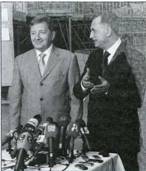 На фото: Д.С. Кива (слева) и Б.В. Колесников отвечают на вопросы журналистов.