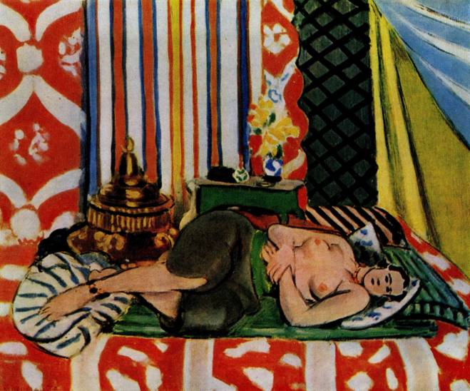 И, конечно, рядом с этим реквизитом предметов в искусстве Матисса существует свой реквизит персонажей: среди них прежде всего изящные молодые женщины и девушки, то в пестрых халатах, то в восточных панталонах, то, наконец, обнаженные; они то лениво возлежат на тахте, то музицируют, то всматриваются в рыбок или праздно сидят, отложивши в сторону книгу.