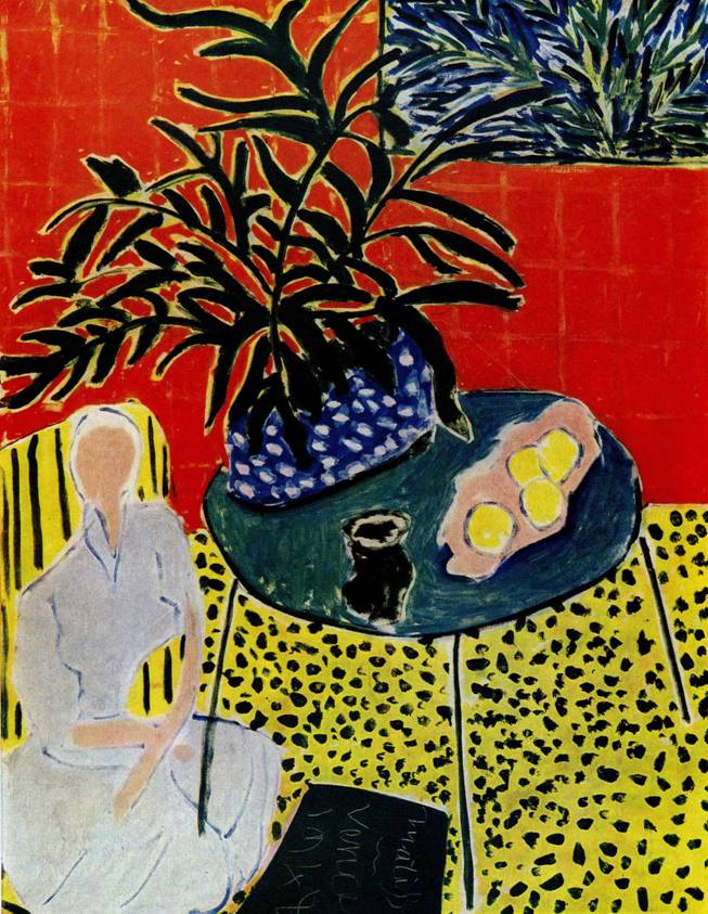 В картинах Матисса почти никогда ничего не происходит. Предметы всего лишь сосуществуют, люди сидят один рядом с другим (лишь в редких случаях люди играют в карты или в шахматы, смотрят задумчиво в окно, но это выглядит как нарушение гармонии, обычно царящей в мире художника). Это вовсе не значит, что в картинах Матисса все изображенное им лишено всякого смысла. Его картины полны внутреннего действия. В них раскрываются такие взаимоотношения между предметами и людьми, которые обычно ускользают от художника. Альфред Барр утверждает, что в натюрмортах Матисса происходят настоящие драмы. В этом утверждении есть некоторая доля преувеличения, драматизм обычно Матиссу чужд. Но, несомненно, в его интерьерах, в фигурных композициях и даже в натюрмортах предметы живут, находятся в живом взаимодействии.