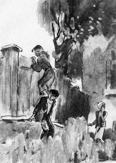 Переді мною стояв літній чоловік, мабуть, якийсь учитель, з розгніваним обличчям. Двері були за його спиною, і я не знав, як утектизвідси. До того ж у кімнаті були ще чоловіки й жінки. Я просто ніяк не міг придумати, що мені робити. Вчитель, що втягнув мене до кімнати, довго й здивовано оглядав мою постать з ніг до голови, наче ніколи не бачив малих хлопців або не міг зрозуміти, звідки я з’явився на підвіконні. Потім обличчя його стало похмуре.