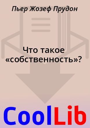 П.Ж. Прудон Что такое «собственность»? или Исследование о принципе права и власти Предисловие Приводимое ниже письмо служило предисловием к первому изданию настоящего сочинения. "Господам членам Безансонской академии Париж, 30 июня 1840 года Милостивые государи! В вашем постановлении от 9 мая 1833 года, касающемся стипендии, учрежденной г-жой Сюар, вы высказали следующее пожелание: "Академия приглашает стипендиата доставлять ей ежегодно, в течение первых двух недель июля месяца, краткий, обстоятельный отчет о своих научных занятиях в течение предыдущего года". ...