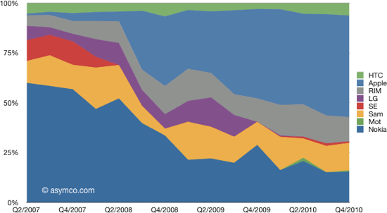 Однако если присмотреться, картина не так безоблачна. Львиная доля телефонов Nokia — копеечные аппараты, популярные в Африке, Индии и Китае. Сколько их не штампуй, много не заработаешь. Если мерять рынок не на штуки, а на доллары, окажется, что нокиевская доля пирога становится меньше год от года. Деньги утекают в направлении Apple: «жалкие» 14,1 миллиона айфонов, проданные в четвертом квартале, принесли этой компании 8,8 миллиарда долларов.