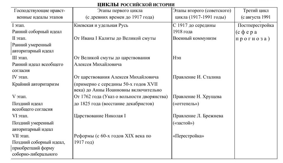 два законченных цикла российской истории и начало третьего, в который общество, по его мнению, вступило после августовских событий 1991 года. Каждый из циклов включает семь этапов. Они формировались взаимопереходами нравственных систем, реализовавшими себя в массовых социальных процессах. Одной из форм раскола является раскол между циклической формой исторических изменений и прогрессом. История страны может быть рассмотрена как результат их взаиморазрушающих и взаимопроникающих отношений.