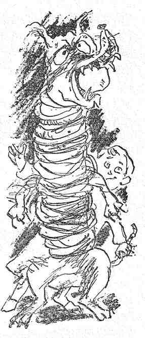 Великий Волк разинул пасть и жутко оскалился на Пекку, а тот не знал, куда спасаться. Хотя он пытался бежать изо всех сил, ноги совсем не двигались… Волк зловеще захохотал и выпустил длинные когтищи, острые, как перочинные ножики… «На помощь! — кричал Пекка. — Медведь, помоги! Волк удрал!» Но его губы не издавали ни звука. А Волк всё скалил зубы. И его смех всё страшнее отдавался эхом в каменных стенах.