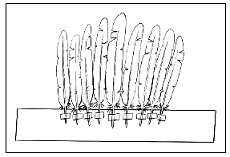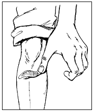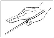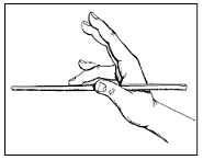 2. Положи палочку (нижнюю) в ложбинку между кистью руки и большим пальцем, при этом её нижний, тонкий конец опирается на безымянный палец, а толстый конец примерно на 1/4 выступает за пределы ладони.
