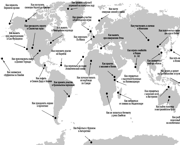 Во время приключений тебе, как и любому путешественнику, придётся преодолевать огромные расстояния – пешком, на лодке, на верблюде и на самолёте. Земной шар делится на 24 участка, похожих на апельсиновые дольки. Они называются часовыми поясами и различаются по времени, которое там протекает. К примеру, когда в Лондоне полдень, в Сиднее, столице Австралии, 11 вечера, а в Нью-Йорке – 7 утра.