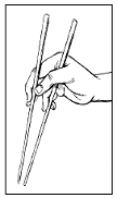 4. Попробуй поднять еду, используя палочки как щипцы. Для этого не шевели нижней палочкой и двигай верхней при помощи указательного и большого пальцев.