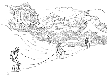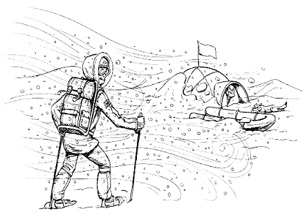 • Если буран начался, когда ты находился в палатке, сиди и жди его окончания. Если тебе необходимо выйти наружу, один конец длинной верёвки привяжи к палатке, а другой – к себе. Во время бурана очень легко потерять лагерь, а по верёвке ты сможешь найти дорогу обратно. Тем не менее будь осторожен – сильный ветер способен сбить тебя с ног.