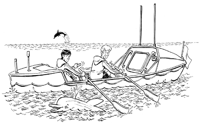 • Если перед тобой разводье, выбора нет – придётся плыть. Будь осторожен: вода здесь ледяная, а глубина достигает 50 метров. Хотя гидрокостюм не пропускает воду, старайся находиться в воде как можно меньше. Прыгнув, начинай плыть, подтягивая за собой сани. Когда достигнешь противоположной стороны, с помощью ледоруба выберись наверх.