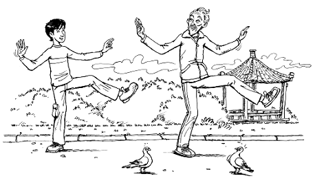 Он предлагает тебе встать в 5 метрах от пня и показывает, как правильно совершать бросок.