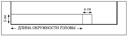 3. От ближайшего к тебе края картона отмерь и отметь высоту 5 см. Используя заданные координаты, нарисуй прямоугольник со сторонами 5 см и величиной окружности твоей головы. Справа прибавь еще 4 см для закрепления головного убора. Вырежи прямоугольник.