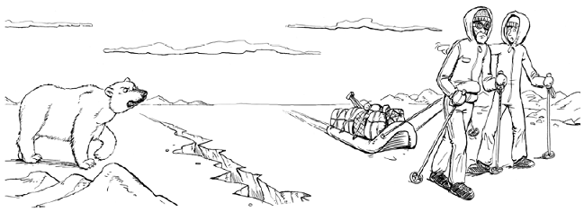 • Помимо низкой температуры, сильных течений и переменчивой погоды, в этих местах есть и другая опасность – голодные белые медведи. Они обитают прямо на льду. Медведи питаются тюленями, но когда еды мало, то не побрезгуют и случайным исследователем. Если ты окончательно застрял, звони по спутниковому телефону и вызывай на помощь спасательный вертолет.