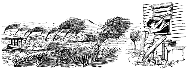 Утром, когда люди начинают просыпаться, в столовой очень тихо. Ураган кончился, и все выходят посмотреть, много ли разрушений. Деревья вырваны с корнем, крыши некоторых служебных построек сильно повреждены. Окна с жалюзи остались целыми, а вот многие прибитые доски сорвало, и стёкла за ними разбились.