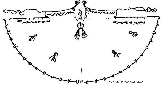 Вони пританцьовували в такт з барабаном, на якому вигравав Чорний Яструб, і тричі обійшли навколо стовпа з щитом. Потім барабан замовк, і всі індійці з заключним войовничим вигуком сіли навпочіпки в коло попереду гостей.