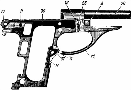 30 служит для соединения деталей и сборочных единиц пистолета. Рамка с основанием рукоятки составляют одно целое.