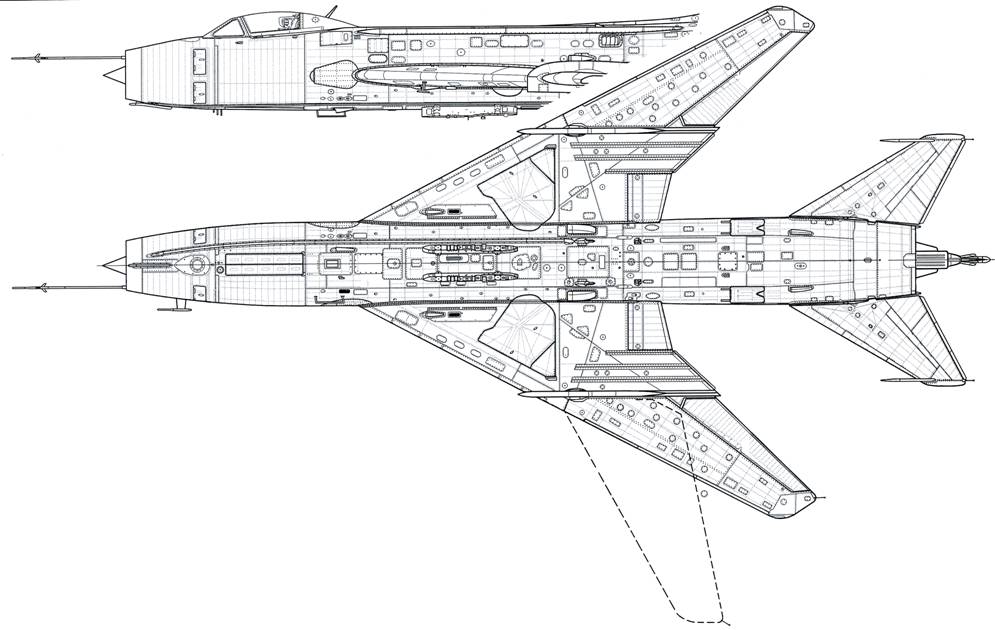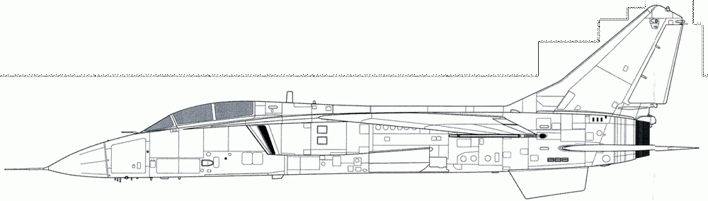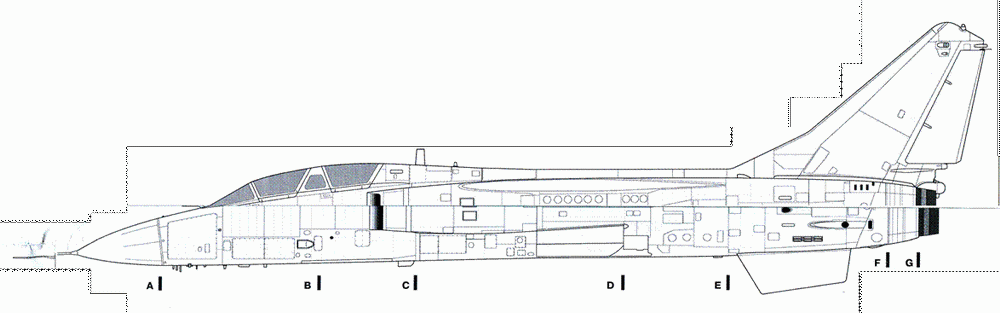 По бортам средней части фюзеляжа располагаются нерегулируемые сверхзвуковые воздухозаборники прямоугольной формы, снабженные отсекателями пограничного слоя. На боковых стенках воздухозаборнйки прямоугольной формы снабженные отсекателями пограничного слоя. На боковых стенках воздушных каналов имеются по две подпружиненные створки перепуска воздуха. Внутри хвостовой части фюзеляжа находятся два маршевых двигателя и ВСУ. На верхней поверхности расположены два тормозных щитка, а непосредственно под килем — контейнер тормозного парашюта.