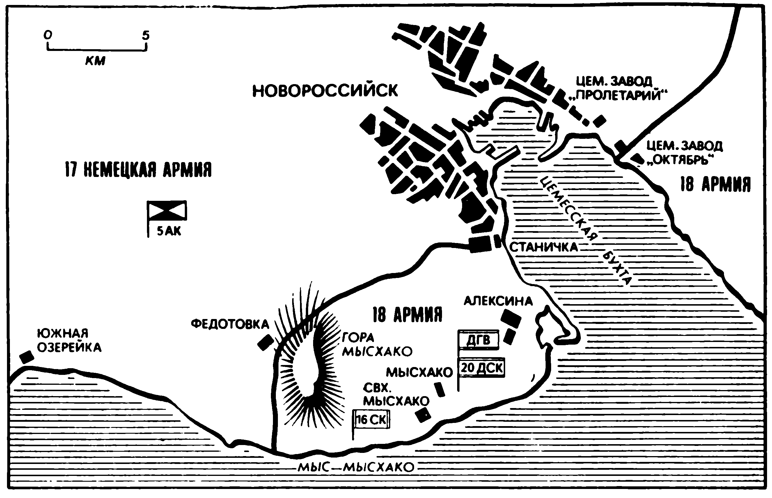 Как появился плацдарм? Новороссийск расположен на берегах Цемесской бухты, которая глубоко врезается в горы. Там два цементных завода — «Пролетарий» и «Октябрь». С одной стороны были мы, а с другой — немцы. К началу 1943 года левый берег весь был у противника, с высот он контролировал движение нашего флота, и надо было этого преимущества его лишить. Вот и родилась мысль: давайте попробуем высадить десант и захватить предместье Новороссийска.