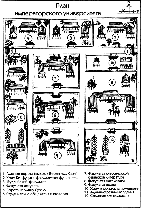 Императорский университет, расположенный к юго-востоку от императорского дворца и основанный в VIII веке, принципом своего устройства повторял китайский образец. Как и государственная система, университет вскоре дал серьезную трещину из-за эгоистических интересов высшей знати, в угоду которой туда стали принимать только сыновей людей так называемого «благородного происхождения». Постепенно дошло до того, что университетские профессора уже не получали достойной платы за свои труды, не проявляли к ним и должного почета. Например, о скромной роли, отведенной им в обществе в 1004 году, можно узнать из «Сказания о Гэндзи», принадлежащего перу госпожи Мурасаки, и из других литературных источников. В те времена также существовали частные учебные заведения, учрежденные несколькими прославленными кланами страны — такими, как род Фудзивара и Татибана, а также единственное высшее учебное заведение для низших сословий, основанное монахом Кобо Даиси при одном из монастырей. Университет следовал конфуцианскому учению, отводя при этом особое место китайскому языку и классической китайской литературе — знания, необходимые тогда для овладения гражданскими профессиями. Студентов набирали в основном из семей, принадлежащих к военному и гражданскому сословию, как из столицы, так и из провинции. Молодые люди мужского пола начиная с одиннадцати лет проходили строгий отбор при поступлении и за время учебы в университете сдавали еще экзамены на промежуточную и продвинутую степени. Для многих людей низкого ранга успешная сдача экзаменов была единственной возможностью получить впоследствии прибыльную должность. К XI веку связи с Китаем в основном прекратились, и знания в области письменного и устного китайского языка существенно ослабли. Кроме того, общественные интересы сместились от таких дисциплин, как история, право и наука о церемониях и ритуалах, в сторону поэзии, принявшей вид развлекательной деятельности. Однако университет, дававший знания китайского языка, классической китайской литературы и конфуцианских учений, по-прежнему обучал таким предметам, как право, математика, высокие искусства и, вероятно, медицина.