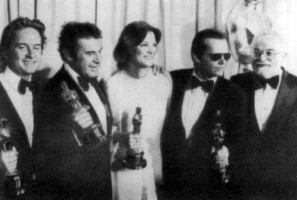 Слева направо: Майкл Дуглас, Милош Форман, Луиза Флетчер, Джек Николсон и продюсер Сол Зэнц на церемонии вручения «Оскара».