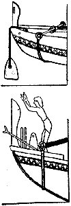 Якорные камни применяли не только для стоянки кораблей, но и для удержания их на курсе. Финикийцы, плавая по Нилу, применяли для этой цели якорный камень, который изображен на рис. 16. В нижней части плоского квадратного камня сделана канавка, в которую закладывалась оттяжка, удерживавшая камень в вертикальном положении. Такой якорный камень оказывал значительно большее сопротивление движению судна.