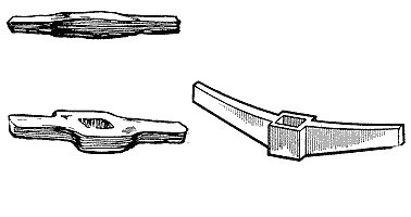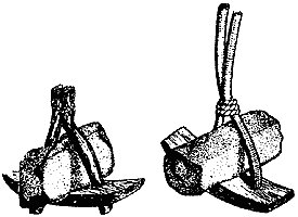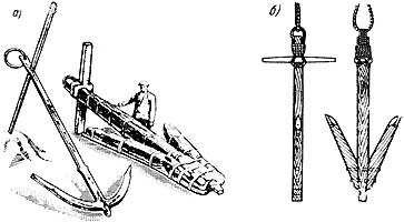 Конструкция двух якорей, изображенных на рис. 12, срисована с подлинных экспонатов Британского Национального музея в Лондоне. Оба якоря были найдены в разное время в разных местах Англии. Фактически это тоже крестовина, сделанная наполовину из камня. Здесь продолговатый камень служит рычагом, переворачивающим при натяжении веревки якорь на бок, на один из двух концов доски, который под действием веса камня заглублялся в грунт.