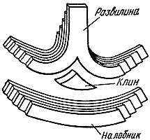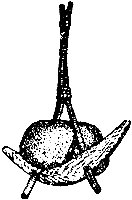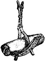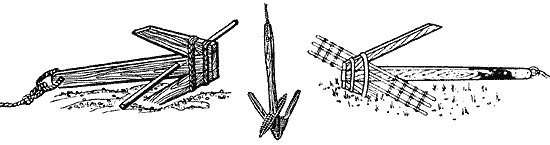 Следующее усовершенствование якорного камня — конструкция, показанная на рис. 9, - крестовина из заостренных сучьев, утяжеленная просверленными камнями. В этой конструкции уже сочетается принцип действия крюка, который заглубляется в грунт, и простого груза. В какой стране и у какого народа якорный камень с крестовиной появился раньше, сказать трудно. Археологические раскопки в различных уголках земного шара свидетельствуют: подобные якорные камни применялись в разных частях света. Камень с крестовиной был распространен от западных берегов Европы до восточных берегов Азии и на побережье обеих Америк.