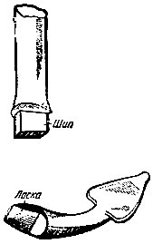 А вот еще два варианта конструкции якоря, из камня и дерева (рис. 15). Достигнув дна, такой якорь может упасть или на торец камня, или на доску. В первом случае он углубится в грунт торцевой частью камня, во втором — торчащим из досок клином или суком. Авторы конструкции (а) — древние обитатели Британии — кельты. Вторая конструкция широко применялась русскими поморами. На рисунке (б) изображен якорь XVII века, хранящийся в краеведческом музее в Холмогорах.