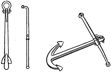 Иногда для проведения аварийно-спасательных работ по снятию судов с мели прибегают к завозке на шлюпках якорей большой держащей силы. Однако перевозка тяжелых якорей на гребных судах — дело, требующее огромного опыта и сноровки, — не всегда удается из-за состояния моря. Во время второй мировой войны советские специалисты разработали конструкцию, показанную на рис. 165. Конструкция якоря железобетонная пустотелая. В веретене сделаны два завинчивающихся отверстия. Когда они закрыты, якорь может плавать. После того как шлюпка отбуксировала его на место закладки, пробки вывинчивают. Заполненный водой якорь погружается на грунт лапой вниз. Шток не дает ему опрокинуться на бок.