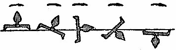 Но держащая сила колод, даже заполненных оловом или серебром, в воде получалась меньше, чем их вес. Такие якоря годились только тогда, когда груз заглублялся в мягкий грунт, например жидкий ил. На твердом грунте кедровые колоды никуда не годились, и финикийские мореплаватели усовершенствовали якорные камни. Вместо двух отверстий в камне они стали сверлить три или пять. Сквозь нижние отверстия они пропускали деревянные колья, заостренные с двух сторон. Под действием веса камня эти колья зацеплялись за грунт, увеличивая держащую силу якорного камня (рис. 8). В какой-то степени такой якорный камень по принципу действия можно сравнить с граблями: углубите грабли в грунт и попробуйте потянуть…