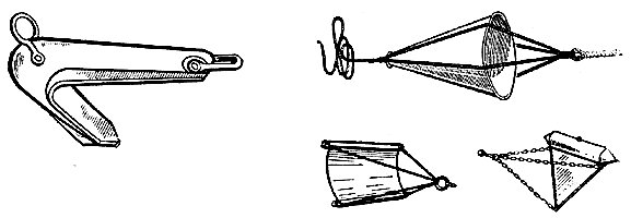 На больших судах, как правило, плавучих якорей нет. В случае необходимости их изготавливают судовыми средствами из бревен, парусины и троса (или цепей). Существует множество конструкций плавучих якорей. Наиболее распространенные из них показаны на рис. 164.
