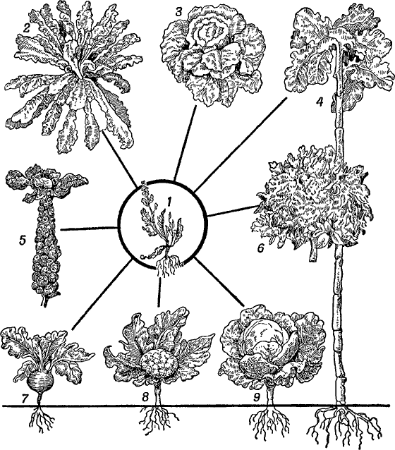 1 — дикая капуста; 2 — лиственная; 3 — савойская; 4 — кормовая; 5 — брюссельская; 6 — брокколи; 7 — кольраби; 8 — цветная; 9 — кочанная.