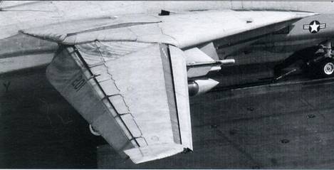 Определенный интерес представляет и система управления поворотом крыла. Ручное управление, свойственное большинству самолетов с КИС того времени, присутствовало и на F-14. Но как резервное. Основную роль играла автоматическая система управления, отвечавшая за положение и крыла, и его механизации. До 0,4М система обеспечивала угол стреловидности крыла в 22°, в диапазоне 0,5–0,9М он варьировался между 20° и 50°. При этом для обеспечения максимальной угловой скорости разворота самолета предкрылки отклонялись системой на угол около 7°, а закрылки — на 10°. Выбор угла стреловидности крыла и положения механизации осуществлялся по данным системы воздушных сигналов в зависимости от числа М и угла атаки. Поскольку F-14 изначально разрабатывался как многоцелевой истребитель, в систему управления крылом был также введен режим BOMB (думаю, перевод не требуется). В этом режиме после взлета крыло фиксировалось в положении 55°. Угол стреловидности 68° предусмотрели для полетов с максимальной сверхзвуковой скоростью.