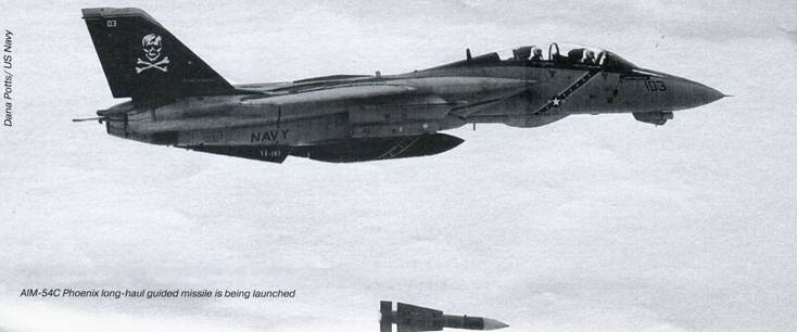 Вообще же, проект F-14 представлял собой сгусток инноваций. Широкое использование титана, на долю которого приходится более 24 % массы конструкции (даже в гидросистеме первоначально использовались только титановые трубопроводы), бороэпоксидная обшивка стабилизатора (кстати, это первый случай практического использования композиционных материалов в авиации), аэродинамически несущий фюзеляж, создававший до 40 % подъемной силы, так называемые ирисовые 1* сопла двигателей. А уж о комплексе БРЭО и говорить не приходится. Запредельные для конца 1960-х гг. дальности обнаружения цели и пуска ракет, одновременное сопровождение 24 целей и пуск по шести наиболее важным. И все это с механическим, а не электронным сканированием луча. Под стать был и «главный калибр» — управляемые ракеты AIM-54 Phoenix с официальной дальностью пуска 100 морских миль (более 185 км).