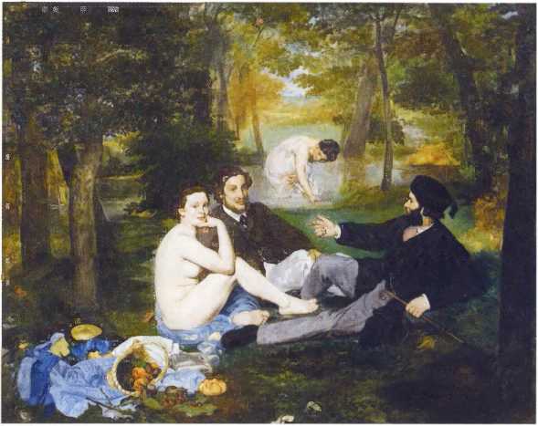 Строго говоря, в картине Мане не было ничего, что могло бы вызвать неприятие зрителя: среди зеленого пейзажа расположились четверо отдыхающих — двое изысканно одетых мужчин (видимо, художников) и две женщины (очевидно, натурщицы), одна обнаженная, другая полуодетая. По существу, художник перенес в современность широко известный шедевр корифея Возрождения Джорджоне «Сельский концерт», стремясь при этом, как утверждал сам Мане, выявить игру различных по силе и тону цветных поверхностей. Тем не менее картина возмутила критиков, а власти признали ее «непристойной» и отказались приобрести. Еще более яростные нападки вызвала «Олимпия», выставленная Мане в Салоне 1865 года и представлявшая современный парафраз «Венер» того же Джорджоне и Тициана. Характерно, что критики, поносившие Мане за «безнравственность», одновременно превозносили близкое по композиции «Рождение Венеры» салонного живописца Кабанеля, полотно гораздо более откровенно эротическое, но щедро приправленное классическим античным гарниром. Так или иначе, в силу сложившихся обстоятельств, Эдуар Мане стал центральной фигурой художественной оппозиции Парижа. Именно он подтолкнул друживших с ним батиньольцев к решительным действиям. Первым смелым решением и явилась выставка 1874 года, которая обозначила важнейший этап в формировании импрессионизма.