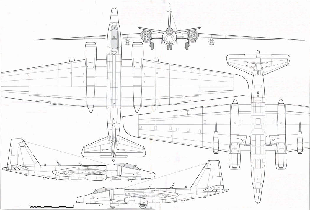 – существенным изменениям подверглись системы самолета. Гидросистему переделали практически полностью и привели в соответствие стандартам США (рабочее давление 210 кг/см² ). Генераторы и гидронасосы смонтировали непосредственно на двигателях (на «Канберре» их устанавливали в отсеке крыла, а для привода служил дополнительный вал). Кислородную систему заменили на американскую. Приемник воздушного давления перенесли из центра носового прозрачного обтекателя под него. На некоторых машинах на время испытаний его монтировали на удлиненной штанге на левом крыле;