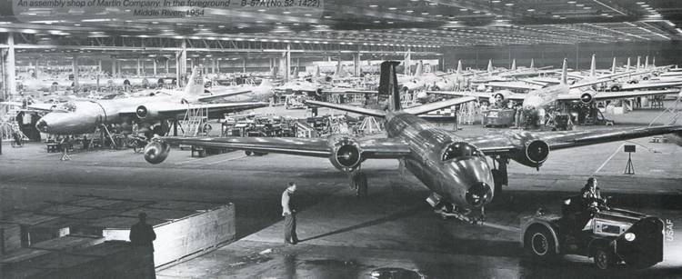 Сборочный цех завода компании «Мартин». На переднем плане – В-57А (№ 52-1422). Миддл Ривер, 1954 г.