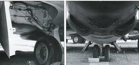 Шасси трехопорное с одноколесными основными опорами и двухколесной передней. Основные опоры закреплены на крыле и убираются к оси самолета в ниши между основным лонжероном и передней стенкой центроплана. Передняя опора убирается по полету в нишу под кабиной экипажа. Стойки всех опор – телескопического типа, имеют масляно-воздушные амортизаторы. На обеих основных стойках установлены посадочно-рулежные фары. Передняя опора – самоориентирующаяся. Основные колеса оснащены дисковыми тормозами.