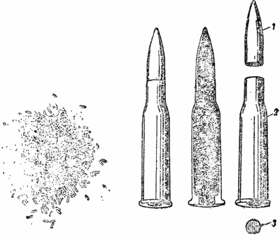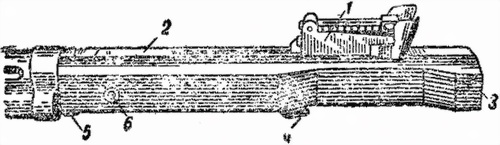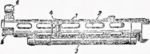 8. Кожух (рис. 5) предохраняет ствол от ударов, а стрелка — от ожогов при стрельбе. Он состоит из двух соединенных между собой труб: верхней — для помещения ствола и нижней — для помещения газового поршня и возвратной пружины.