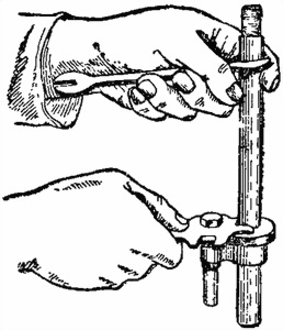 1. Перед постановкой прибора на магазин нужно закрепить рычаг подачи, для чего, сближая правой рукой рукоятки прибора, левой рукой опустить подаватель вниз; при этом нижний зуб подавателя упирается в кромку основания.