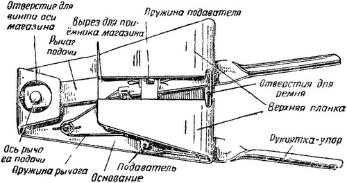 защёлки с пружиной и служит упором для заднего конца возвратно-боевой пружины, заменяя таким образом соединительную муфту пулемета ДП.