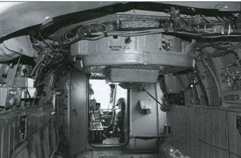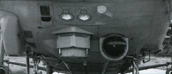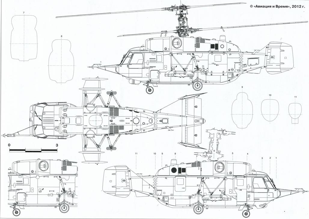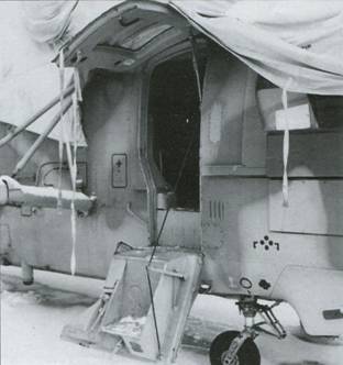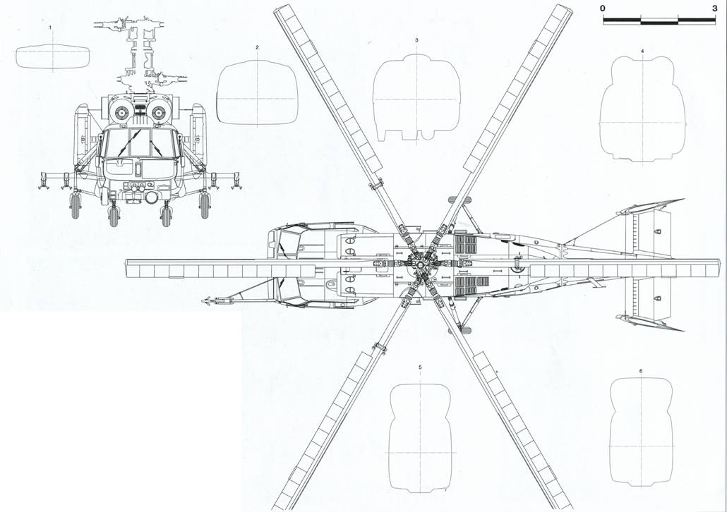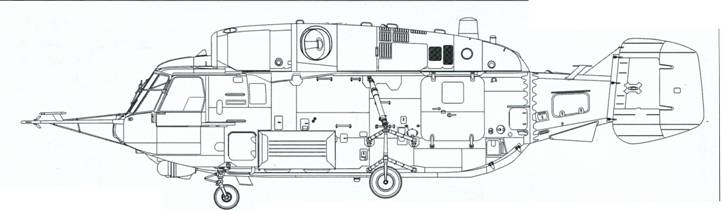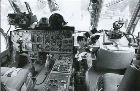 Вверху: потолочная панель кабины экипажа. Ниже: посадочные фары, закрытый створками визир оптического наблюдательного прибора и обтекатель антенны системы наведения ПТУР. Внизу: грузовая кабина Ка-29 (по полету и против него)