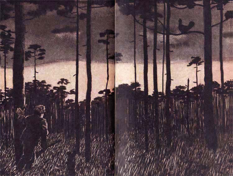 «Тк-тк-тк!..»— звал его глухарь. Этот, наверно, ближе всех. Он где-то совсем рядом и, кажется, сидит очень низко. «Тк-тк-тк!»— петух будто приглашал его поиграть в пятнашки с завязанными глазами. «Тк-тк-тэк…» Да где же он? И Борис Зиновьевич нырнул в темный ельник навстречу своей судьбе.