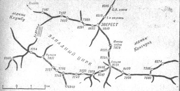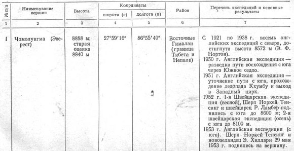 Оценка высот других вершин, расположенных в районе Чомолунгмы, естественно зависит от принятой для Эвереста высоты. Если мы считаем, что Эверест имеет высоту 8888 м, то было бы совершенно нелогично в то же время оставить, например, для высоты Макалу прежнее значение 8470 м. Вот почему мы сочли нужным указать для всех восьмитысячников, расположенных поблизости от Эвереста, наряду со старыми высотными отметками новые, более близкие к действительности значения высот.
