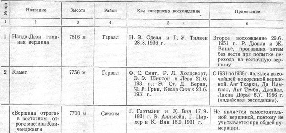 В настоящее время мы насчитываем 14 восьмитысячников, имея в виду самостоятельные горы выше 8000 м, а не различные вершины одного и того же массива. Еще в 1939 г. я составил их список в правильной, по-видимому, последовательности. Эта таблица, помещенная в несколько измененном виде в данной книге, содержит средние значения высот, которые в будущем могут быть несколько изменены в результате новых измерений и вычислений. 10 из, 14 этих горных гигантов находятся в собственно Гималаях, четыре в Каракоруме. Если мы причислим к восьмитысячникам и вершины высотою от 7925 м (26000 футов) до 8000 м, то их получится в общей сложности 17-11 в Гималаях, 6 в Каракоруме.