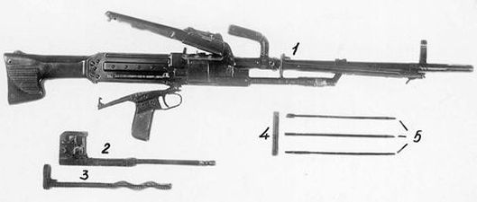 – на задней части приклада смонтирован наплечник и введён щелевой пламегаситель с широкой нижней перемычкой, выполняющей функции компенсатора (оба эти изменения, в сочетании с сошкой на дульной части ствола, были направлены на улучшение кучности боя пулемёта);